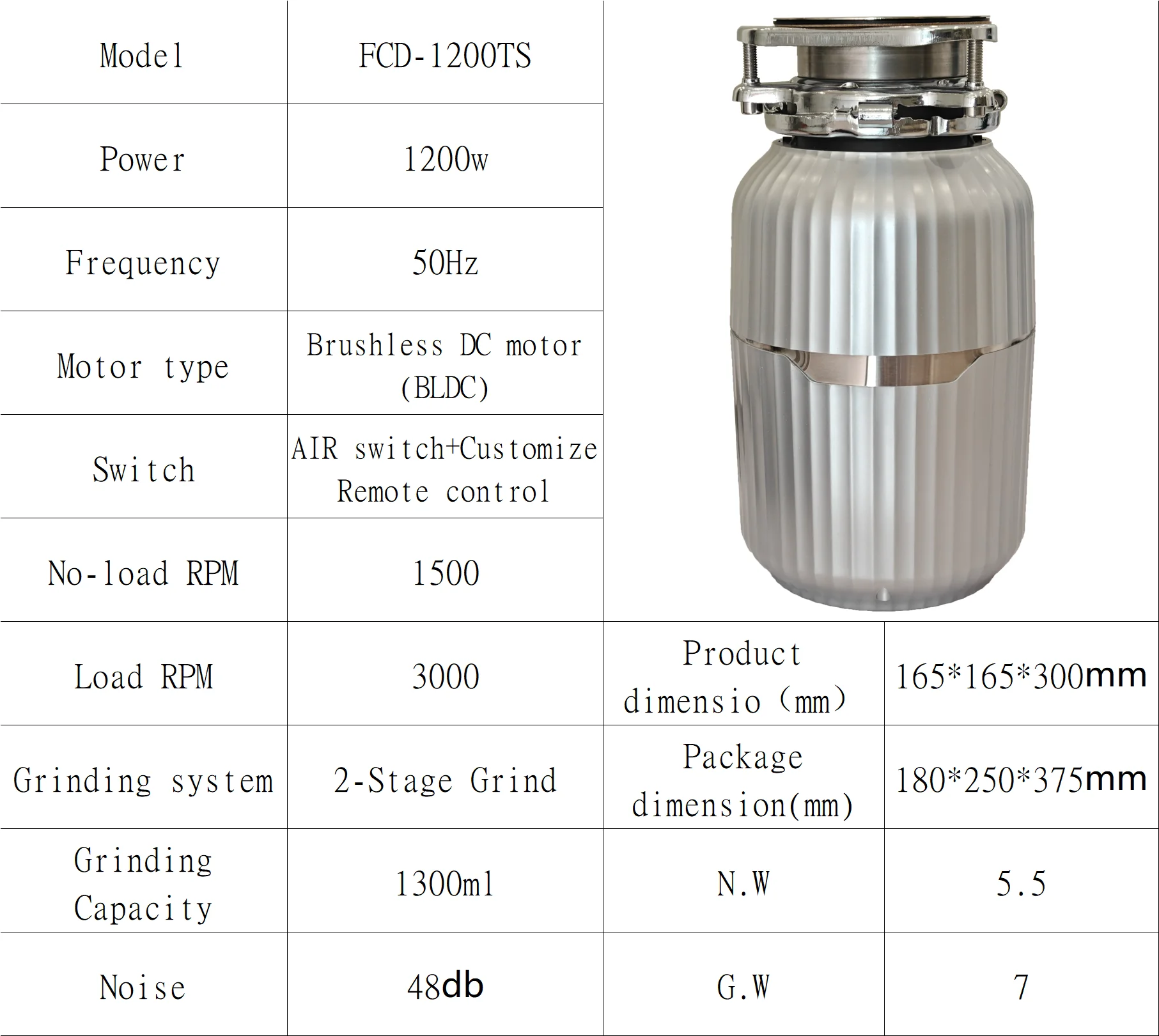 BLDC Features 1. More power 1200w. Shredding faster 2. Air switch and remote control can be operated at the same time. 3. Automatic forward and reverse rotation to prevent jamming, 4. Smart Grinder can speed up, slow down, and shut down itself 5. Quieter and longer life