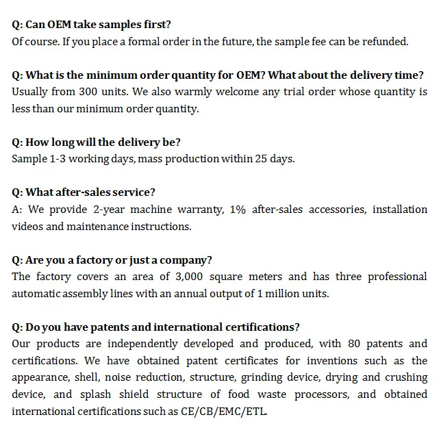 Our products are independently developed and produced, with 80 patents and certifications. We have obtained patent certificates for inventions such as the appearance, shell, noise reduction, structure, grinding device, drying and crushing device, and splash shield structure of food waste processors, and obtained international certifications such as CE/CB/EMC/ETL.